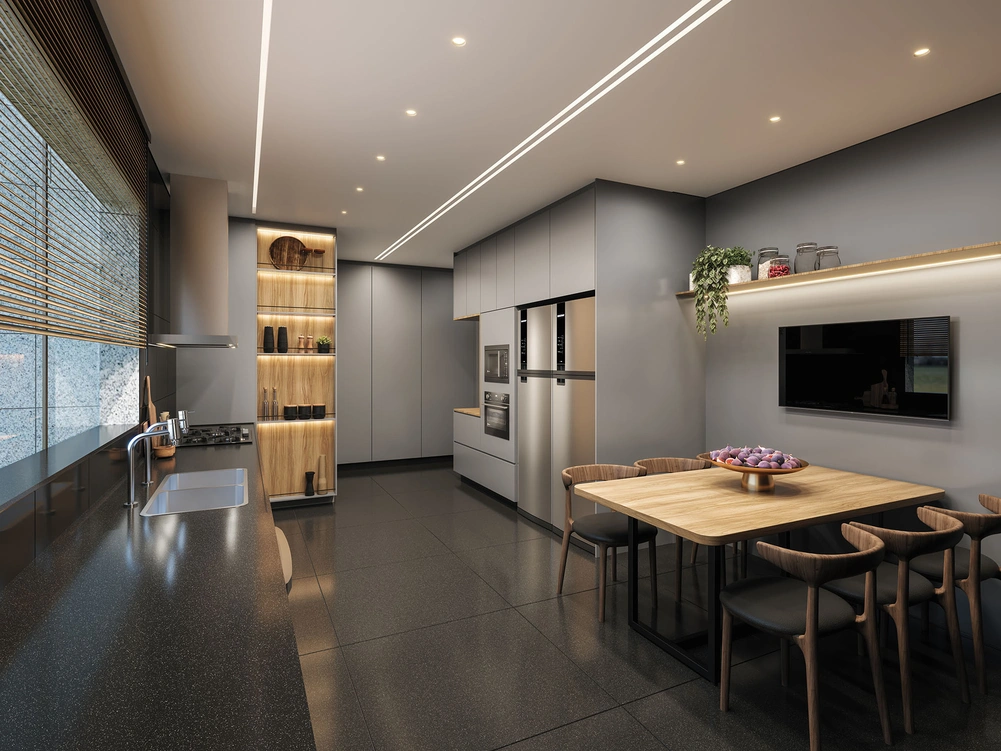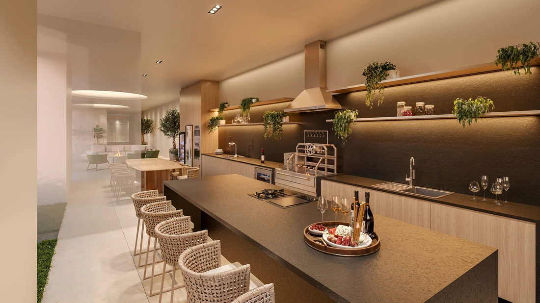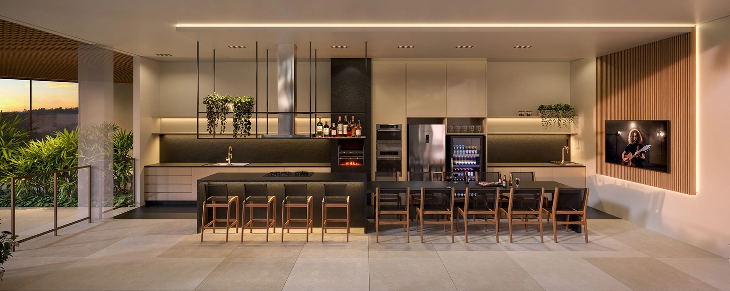 O apartamento de 263,79 m² no High Gardens é um verdadeiro símbolo de requinte. Composto por 4 suítes, cada uma delas é um espaço de tranquilidade, ideal para relaxar após um dia agitado. A suíte master, especialmente, conta com dois closets, uma banheira de hidromassagem e chuveiros duplos, criando um ambiente de spa dentro de casa. A cozinha, revestida em granito, possui uma ampla bancada com cuba dupla e metais de alta qualidade, perfeita para quem aprecia a arte de cozinhar. Além disso, as varandas equipadas com churrasqueira a carvão e sistema de exaustão central ampliam as possibilidades de convivência e lazer.