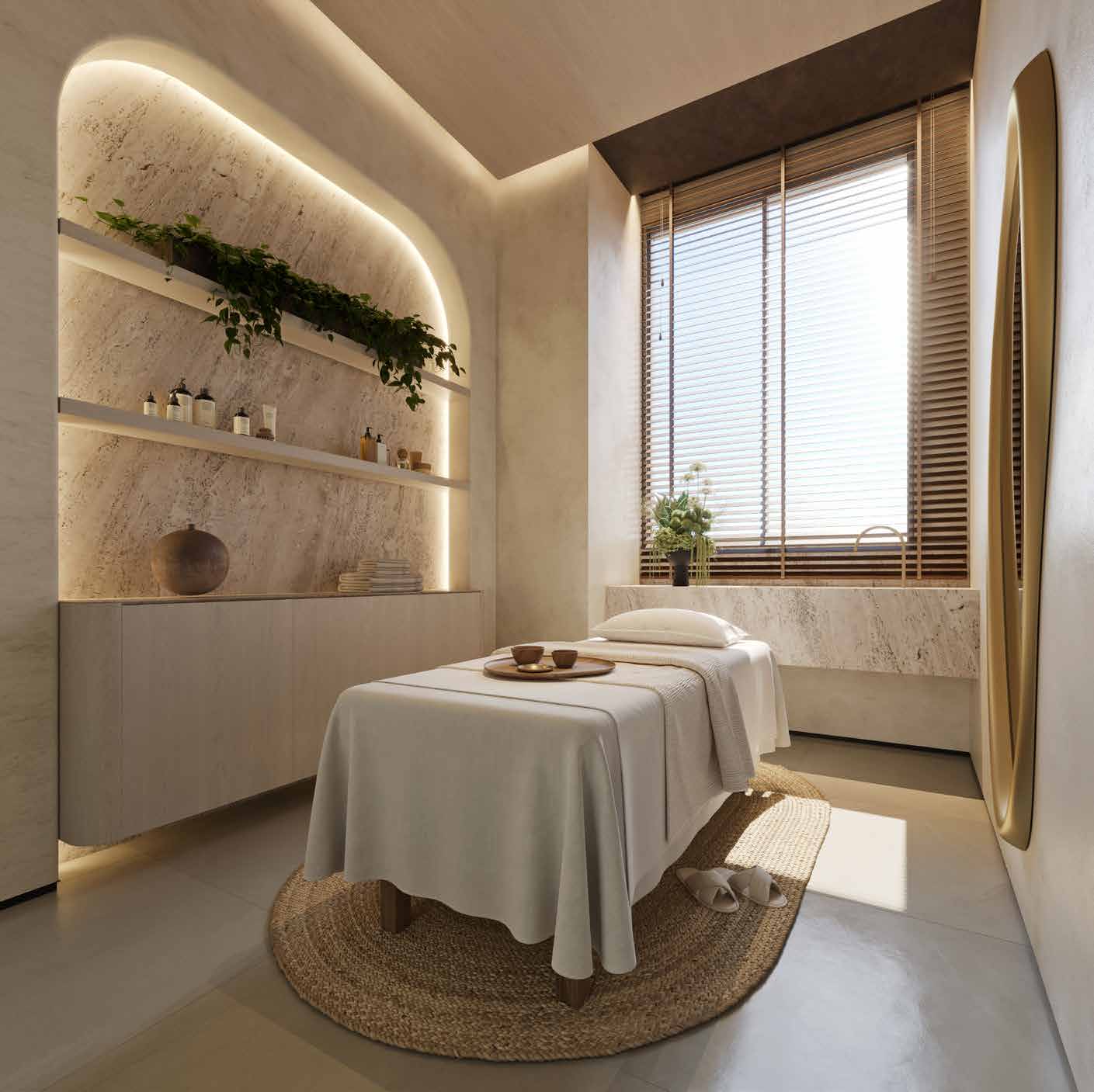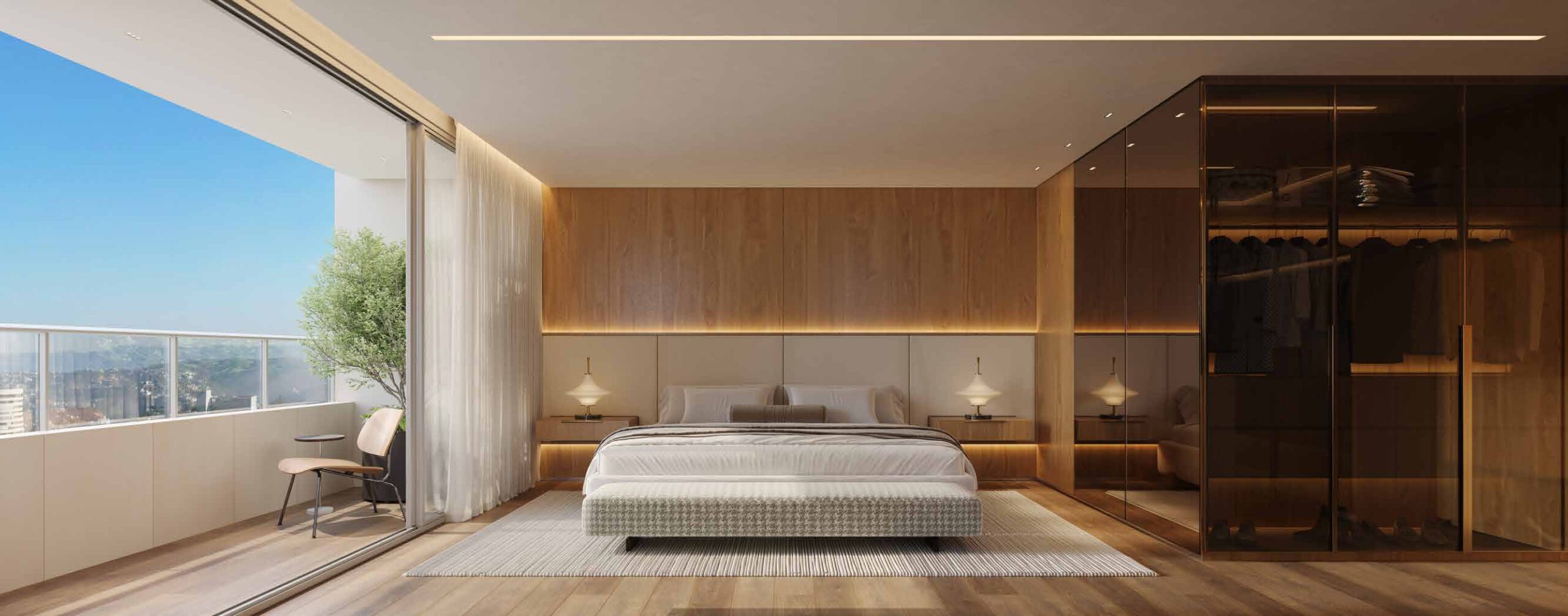 A suíte master conta com closet e acesso direto à varanda, garantindo um refúgio privativo de excelência. Os acabamentos de alto padrão, a iluminação projetada e a integração entre ambientes internos e externos definem o padrão construtivo do Città Sereno — imponente no skyline, sereno no cotidiano.