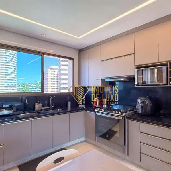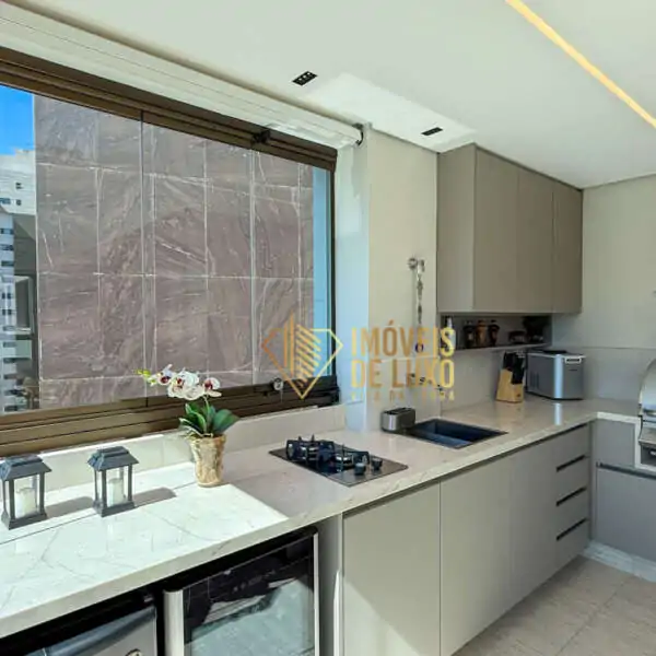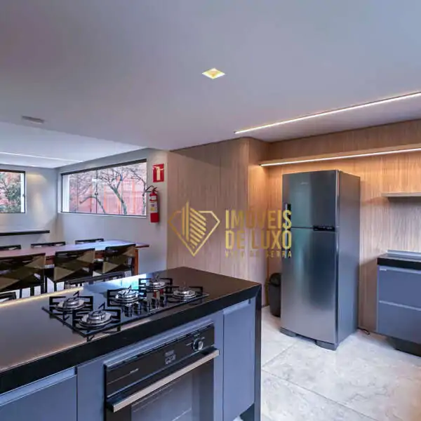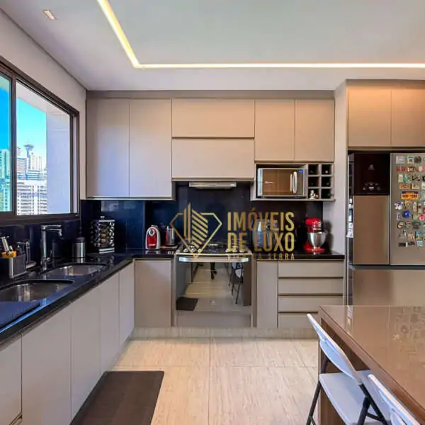 Moderna e bem equipada, a cozinha pode ser integrada à sala através de um painel de madeira, oferecendo flexibilidade e praticidade para o seu dia a dia.