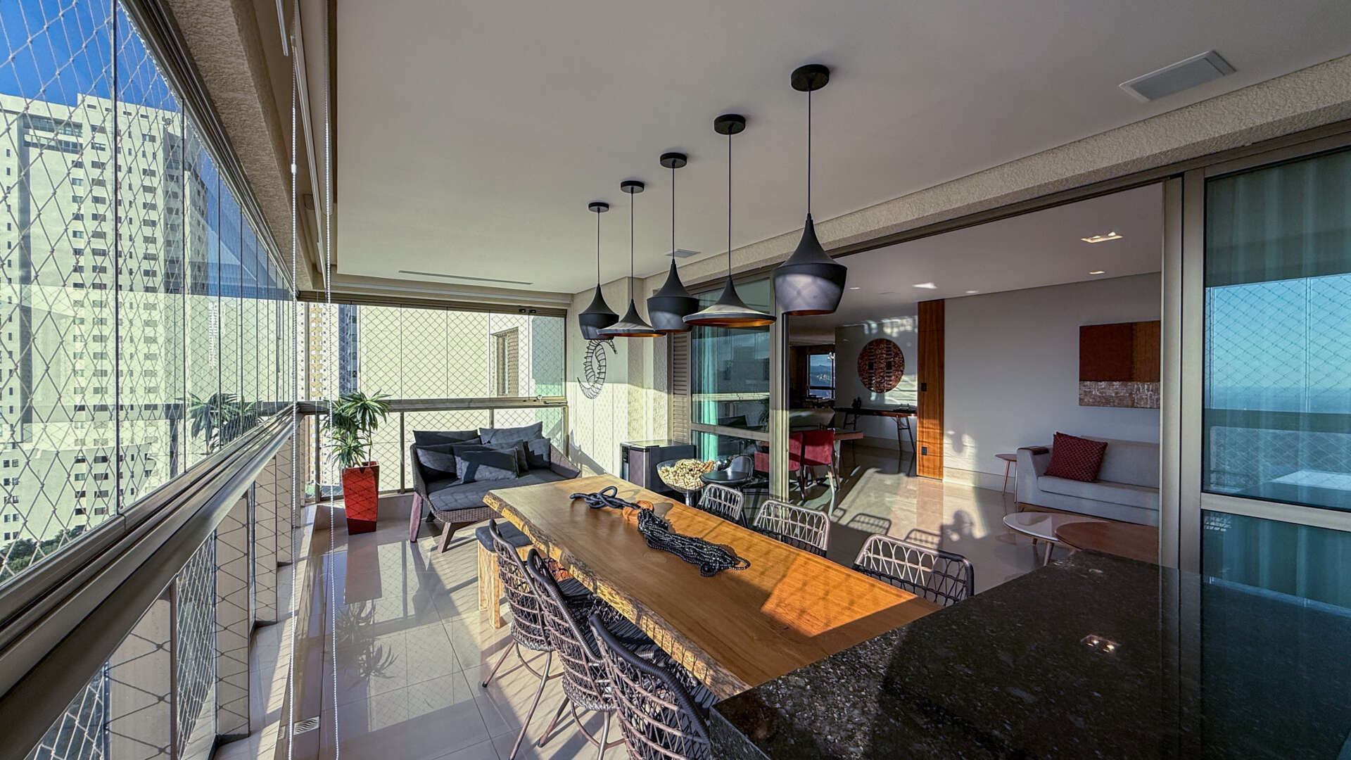 A varanda gourmet é um verdadeiro convite ao lazer: bancada em granito, churrasqueira a carvão, mesa de jantar para oito lugares e uma vista definitiva para o skyline de Belo Horizonte.