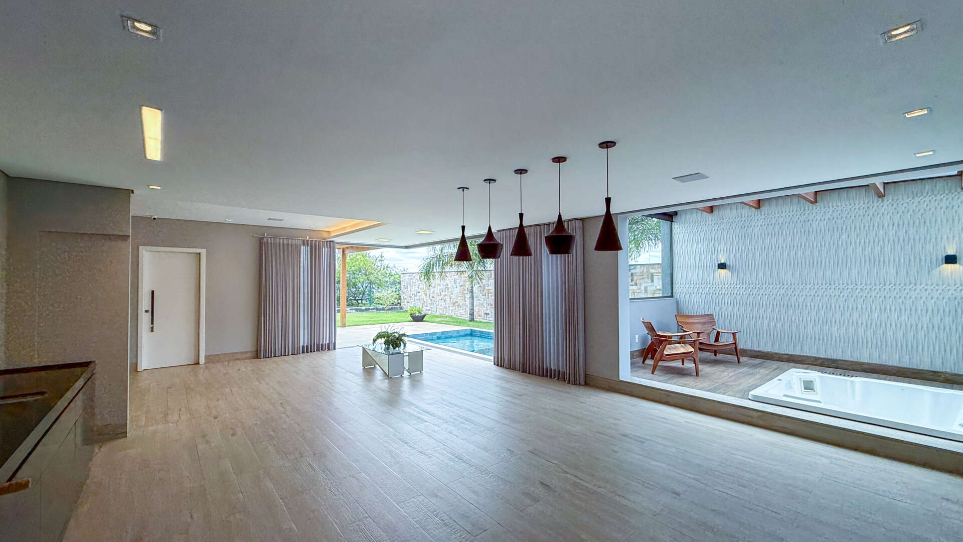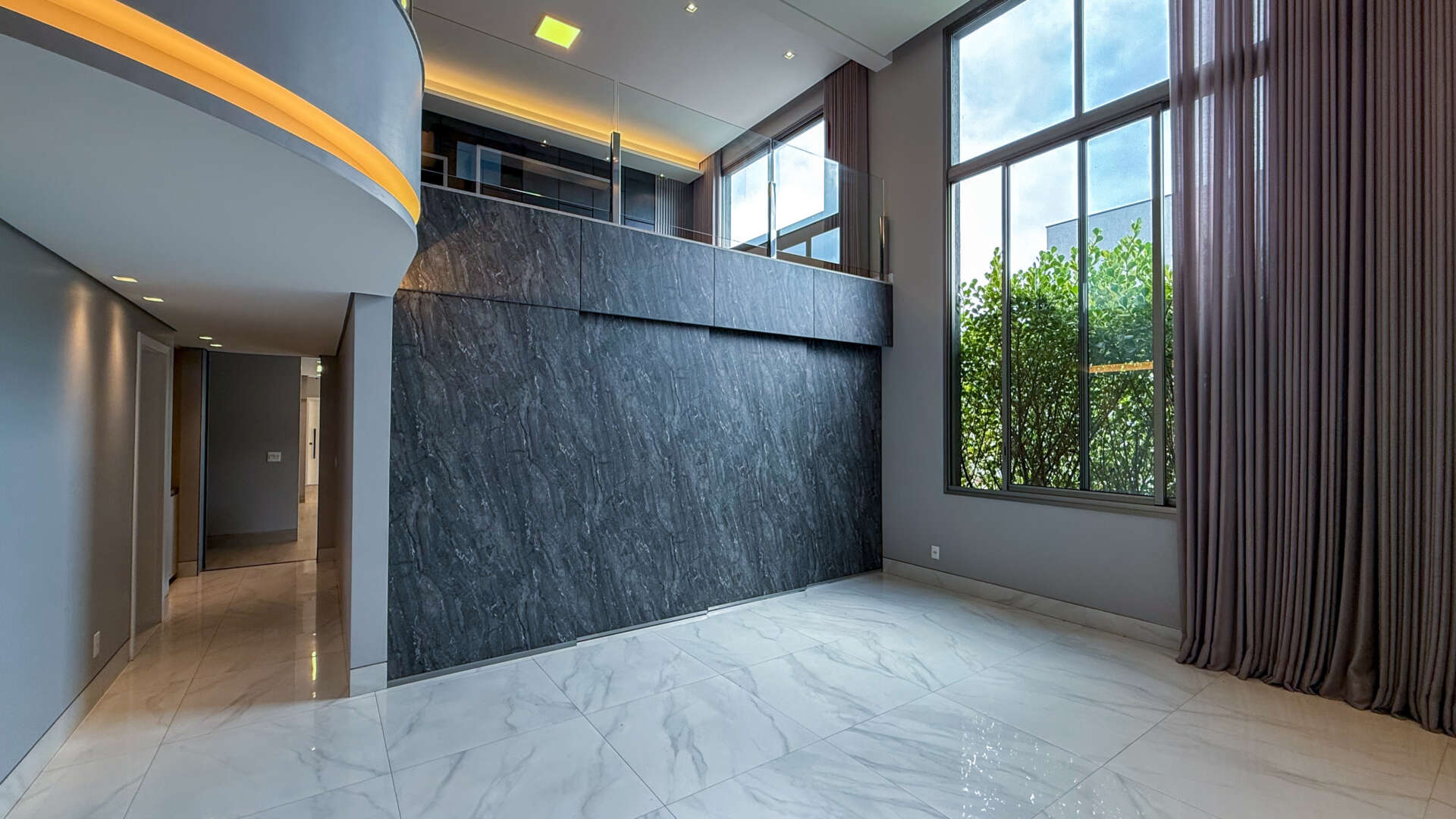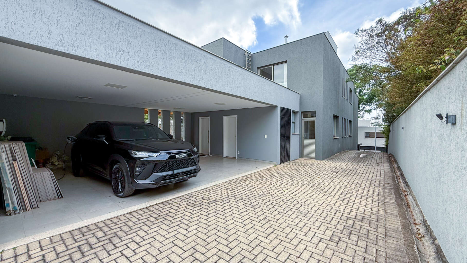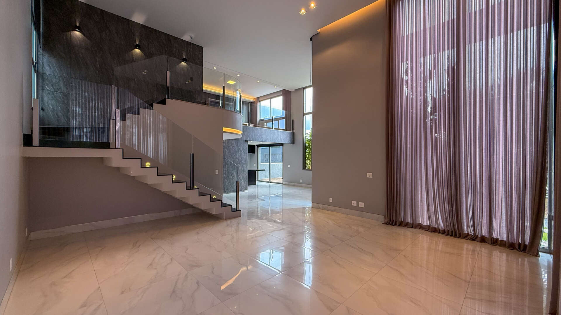 A sala ampla para três ambientes impressiona com seu pé-direito duplo, que valoriza a iluminação natural e traz uma sensação de amplitude e requinte. A garagem para até quatro carros oferece praticidade e segurança para toda a família.
